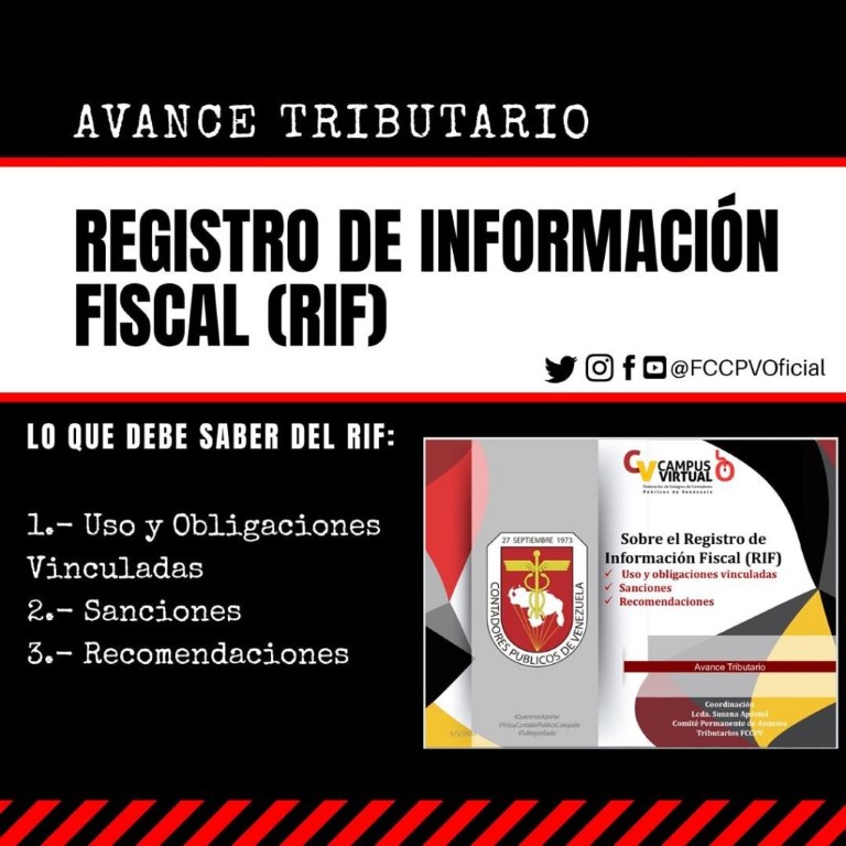 AVANCE TRIBUTARIO: El Comité Permanente de Asuntos Tributarios @cpat_fccpv a través de la Secretaría de Estudios e Investigaciones de la @fccpvoficial elabora material de referencia acerca del Registro de Información Fiscal (RIF); Uso y Obligaciones vinculadas; sanciones y responsabilidades.