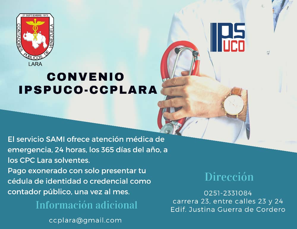 Servicio SAMI, atención médica de emergencia las 24 horas al día (Ver horario), exonerado una vez al mes, con solo presentar la cédula de identidad o Credencial Digital como Contador Público Colegiado del Estado Lara.