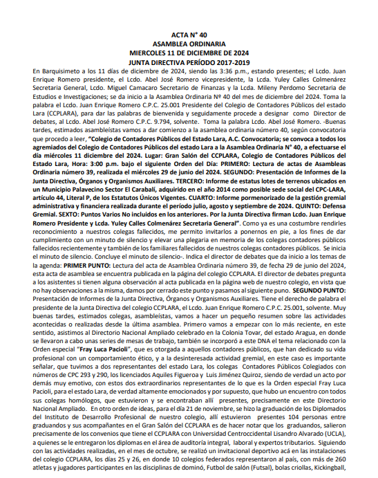 Acta de Asamblea Ordinaria Nº 40, de fecha 11 de diciembre de 2024.
