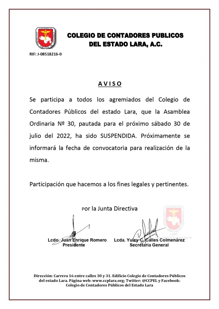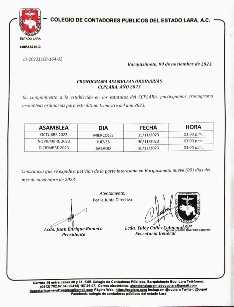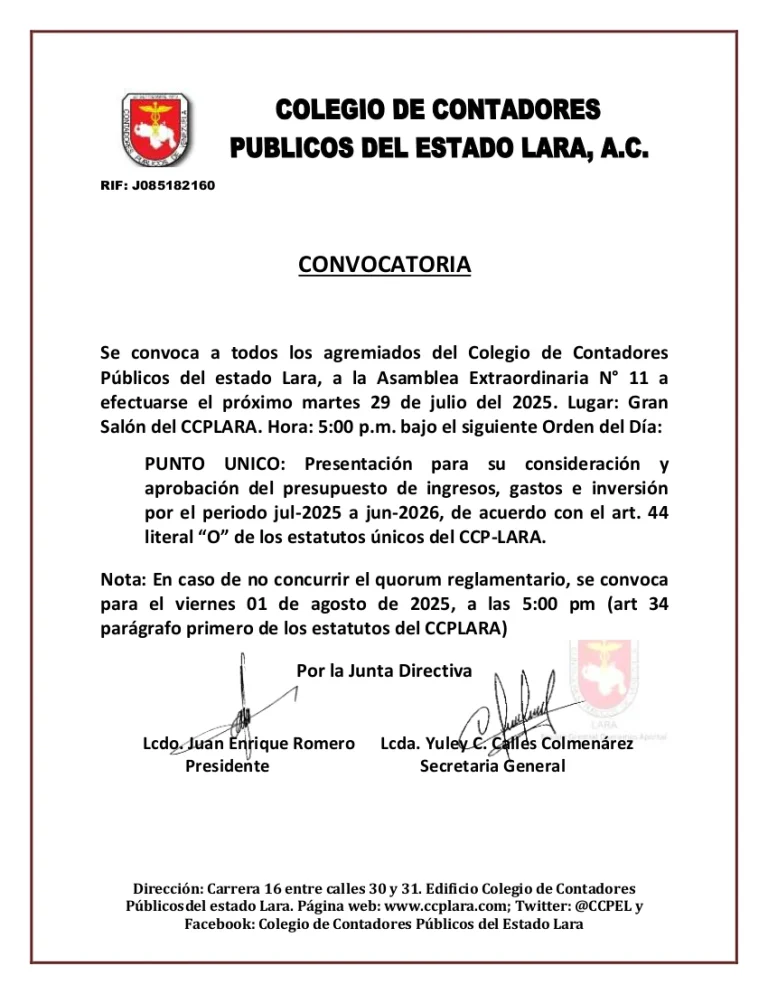 La Junta Directiva del Colegio de Contadores Públicos del estado Lara, pone a disposición de todos sus agremiados las convocatorias desarrolladas en nuestra institución